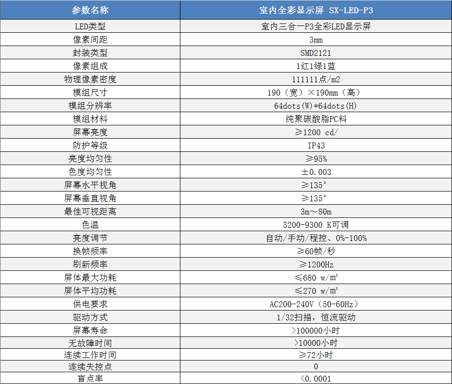 P3室內小間距高清全彩LED顯示屏技術參數: